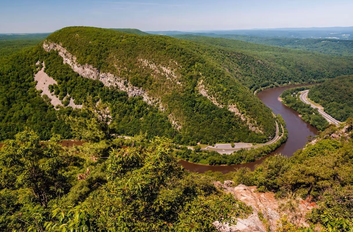 Standing on Mount Tammany's precipice feels like being suspended between sky and water. The Delaware River snakes through the gap 1,200 feet below while Mount Minsi rises across the water in Pennsylvania. On clear days, you can see the Catskills shimmering to the north and the Pocono Mountains rolling west. The rock beneath your feet is 450-million-year-old quartzite, older than the first fish with backbones.